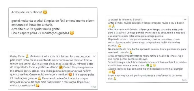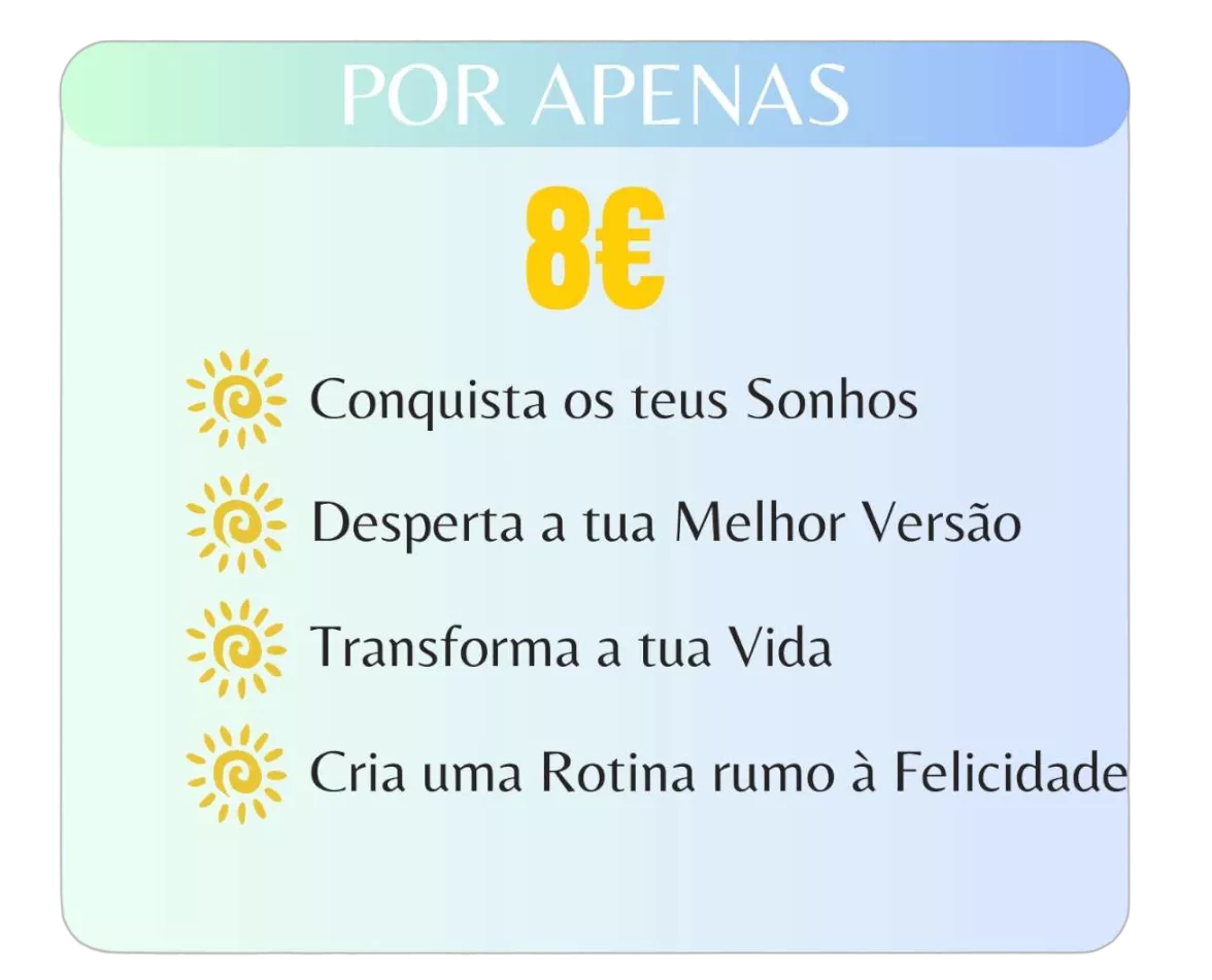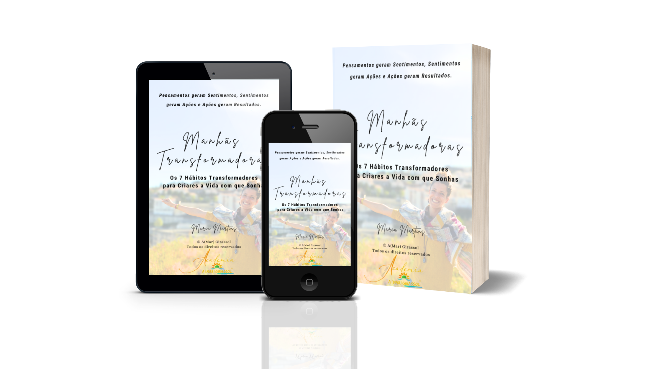 Agora, partilha o seu conhecimento e experiência através do Ebook "Manhãs Transformadoras - Os 7 Hábitos para criares a vida com que sonhas". Mergulha nas páginas deste guia enriquecedor e descobre os segredos que a ajudaram a transformar as suas manhãs em rituais revigorantes e cheios de propósito.